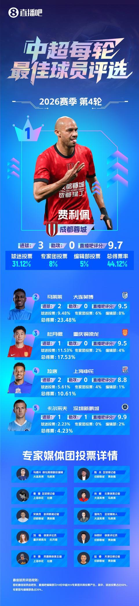 直播吧2026中超第4轮最佳球员评选结果出炉,最终成都蓉城外援费利佩以44.12%总得票率当选。