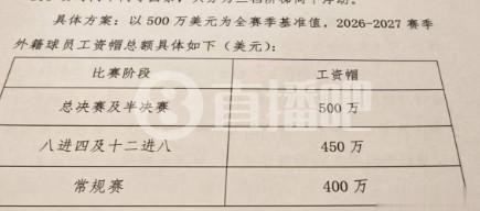有关于外援还有工资帽的调整,下赛季外援薪资以500万美元为基础值,球队没有进入季后赛,工资帽为400万美元。打进季后赛但没进半决赛,工资帽为450万美元,打到总决赛及半决赛,工资帽为500万美元。