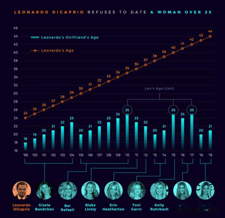 过去多年,莱昂纳多与多位比自己年轻许多的伴侣有过交往,一直是舆论焦点。