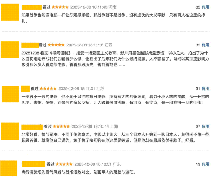 更难得的是口碑爆棚,观众清一色好评,有人冲着主创团队而来,有人被小人物的抗战故事打动,而更多人直呼被尹正的突破性表演惊掉下巴,不少网友认可肖战的蜕变,就连配角尹正也在电影中交出了让观众一时没认出来的换脸式演技。