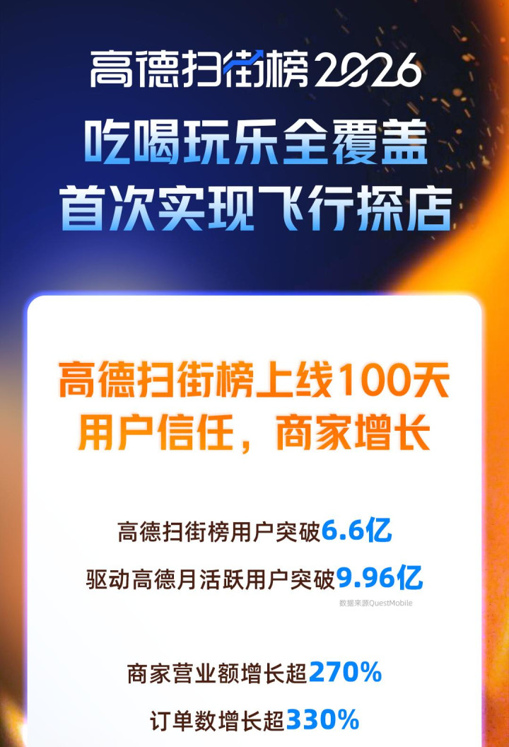 此次高德扫街榜的“百日宴”升级,干货直接拉满。最吸睛的全球首个“飞行街景”,基于自研世界模型,能让用户出发前就“飞”抵目的地,沉浸式预览街区风貌乃至餐厅内部环境,打通规划到体验的预览闭环;还有应季应时的“动态榜单”,靠海量数据自动生成6500多个时令与品类榜,从春日赏花到深秋露营,精准踩中当下消费需求;新增的社交分享功能,支持用户建专属榜单、看好友推荐,让找店多了份信任感与趣味性。短短百天,扫街榜就揽入86万新商家,商家订单量环比暴涨330%+,营业额增幅达270%,据QuestMobile数据,用户累计使用人数破6.6亿,直接将高德APP月活推至9.96亿,爆款实力毋庸置疑。